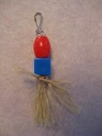 Il a un perchoir solide, est en bois peint au colorant alimentaire et a une petite corde avec des billes pour que l'humain (ou l'oiseau peut-être?) puisse le tirer avec l'option de pouvoir le retirer avec les attaches.